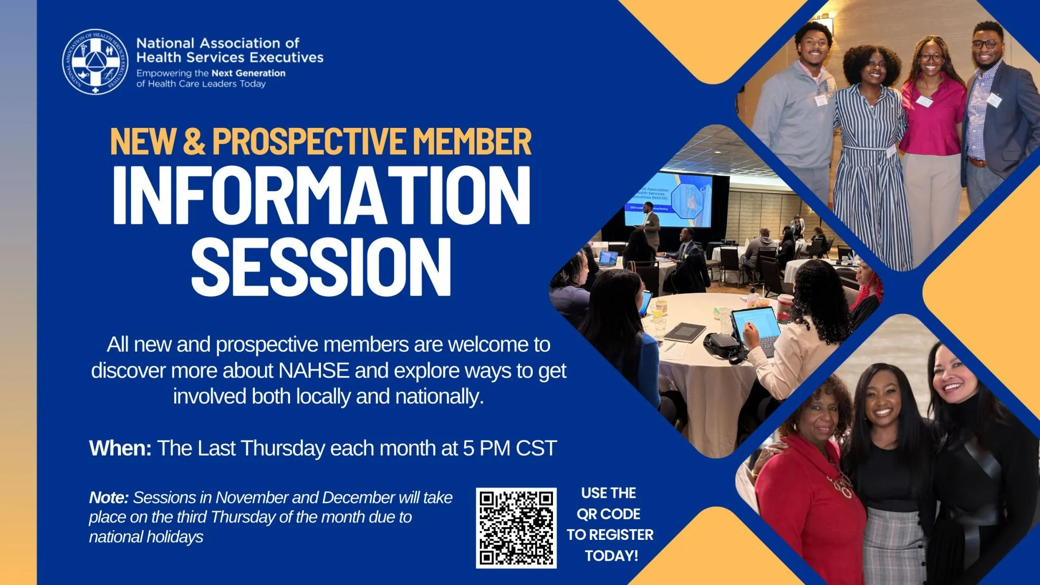 NAHSE National New & Prospective Member Information Session Thursday, April 23, 2026 6:00 PM 7:30 PM 18:00 19:30 Google Calendar ICS The National Association of Health Services Executives invites you to join our New & Prospective Member Information Session, a chance to explore what it truly means to be part of a national movement advancing healthcare leadership and health equity. Register Today